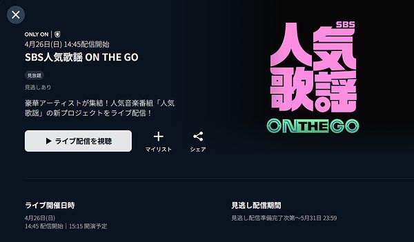 韓国SBSにて2026年4月26日(日)15:15より生放送される「SBS人気歌謡 ON THE GO」をU-NEXTでライブ配信します。